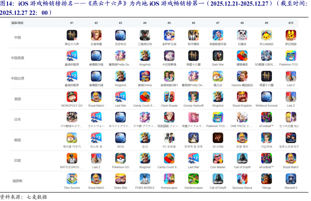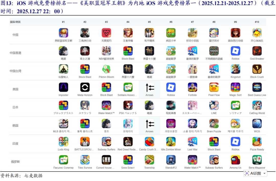 根据七麦数据,截至2025年12月27日22:00,《美职篮冠军王朝》获内地iOS游戏免费榜第一,《燕云十六声》获内地iOS游戏畅销榜第一。
