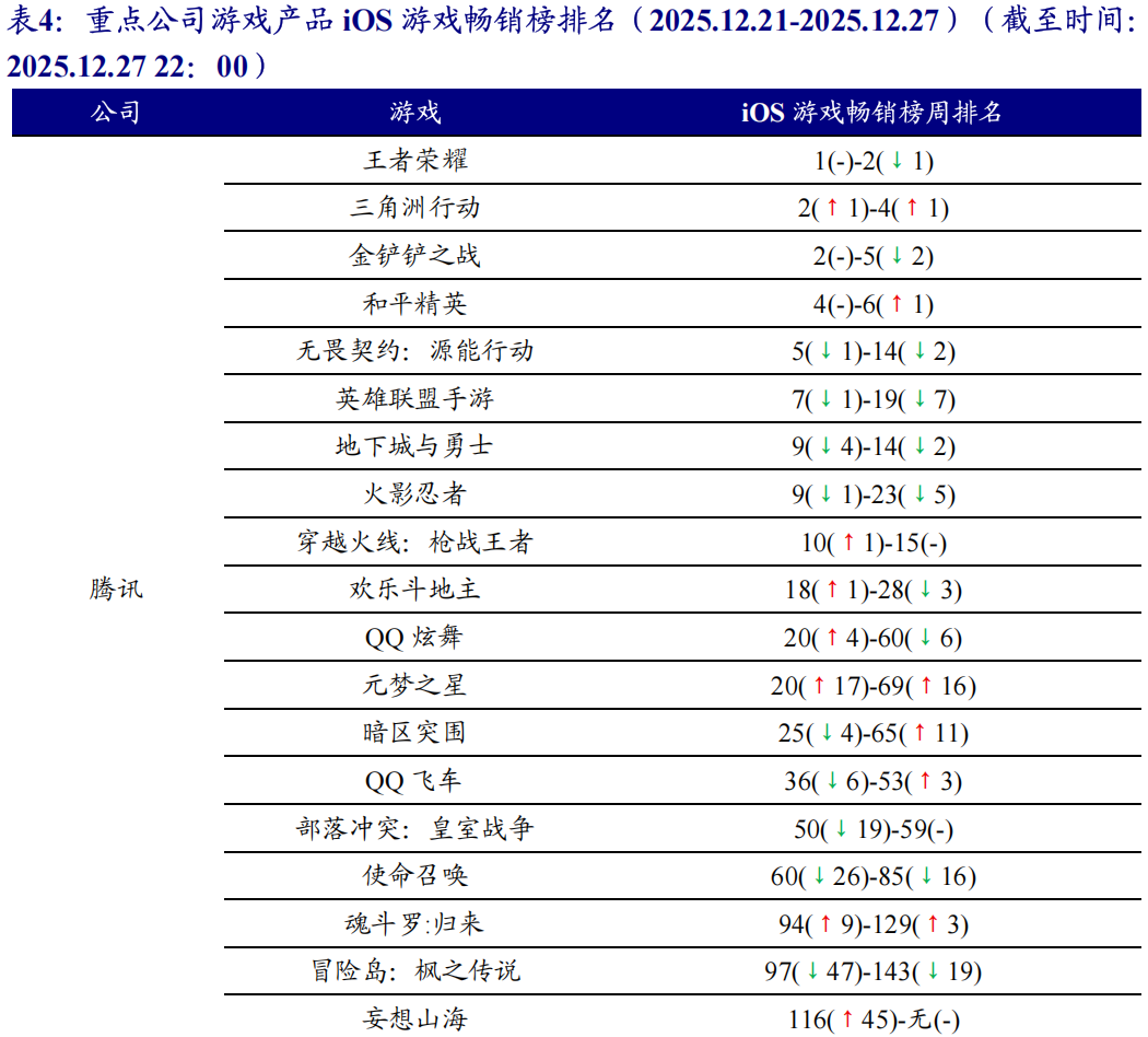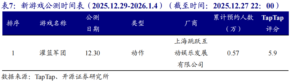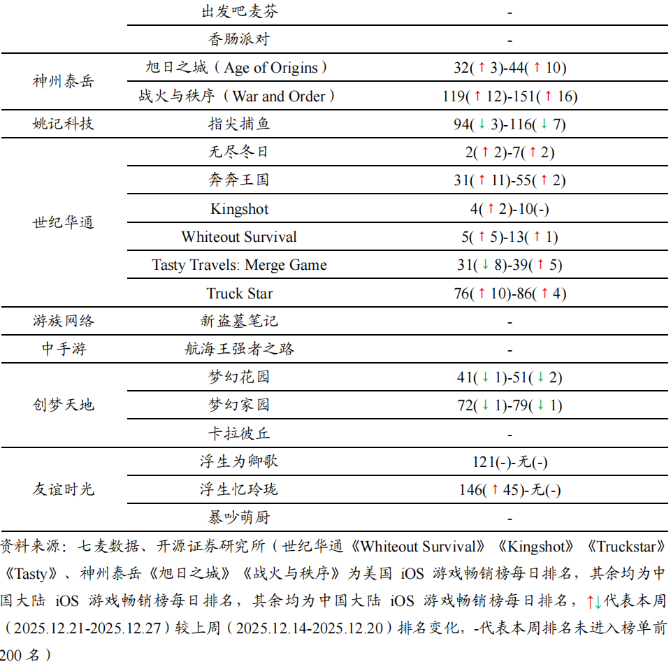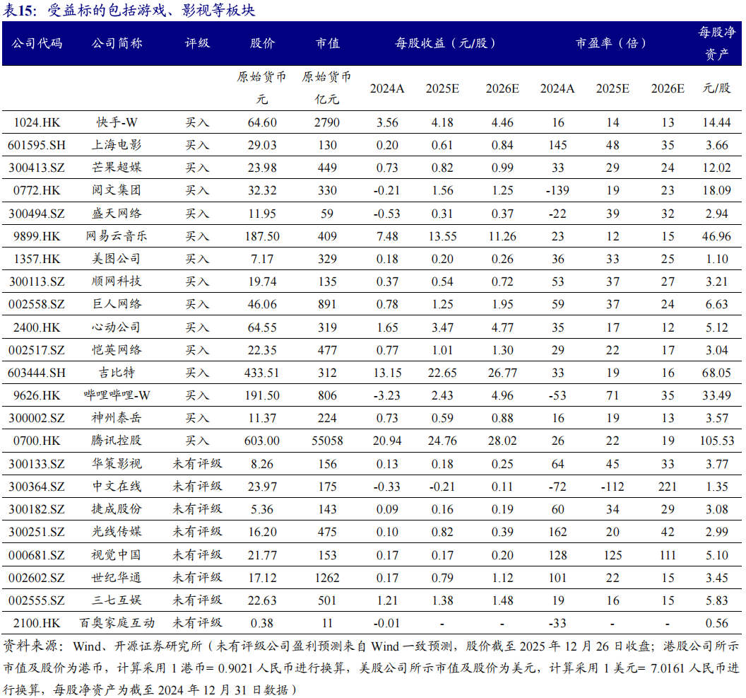 12月25日,国家新闻出版署发布12月147款游戏版号信息,至此2025全年共发放游戏版号1771个,数量创2019年以来新高,较2024年增长超过20%,一方面给后续新游供给释放提供充足的版号储备,另一方面也体现政策对于游戏的持续支持。新游方面,巨人网络《名将杀》已于12.19开测,关注后续推广进展,《超自然行动组》已上线港澳台地区,开启出海;金山软件《鹅鸭杀》将于2026.1.7上线,心动公司《心动小镇》或于2026年初海外地区全平台上线。另外,国内元旦、寒假及春节假期旺季将至,《超自然行动组》《心动小镇》等大DAU、强社交游戏或迎来用户增量及ARPU提升。我们建议继续关注新游上线及老游运营活动,把握供需共振下景气度向上、且估值性价比突出的游戏板块投资机会,重点推荐巨人网络、心动公司、恺英网络、吉比特、哔哩哔哩、神州泰岳、腾讯控股,受益标的包括世纪华通、三七互娱、百奥家庭互动等。