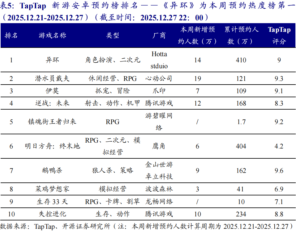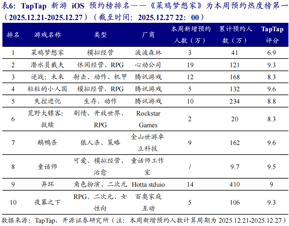 根据TapTap,截至2025年12月27日22:00,《异环》为安卓预约榜第一,《菜鸡梦想家》为iOS预约榜第一。