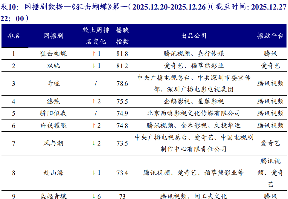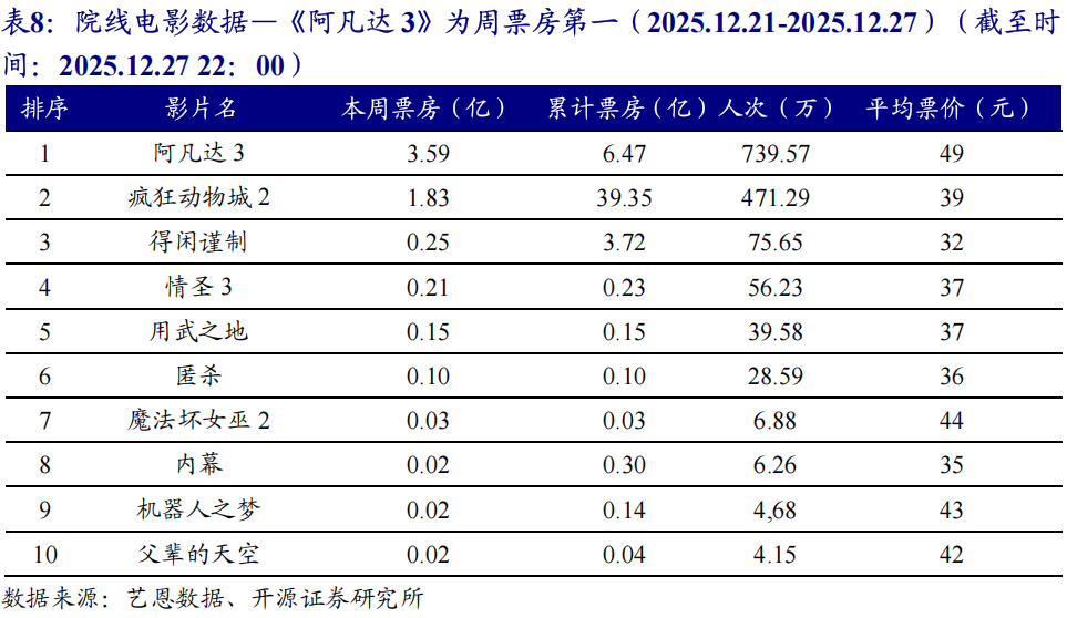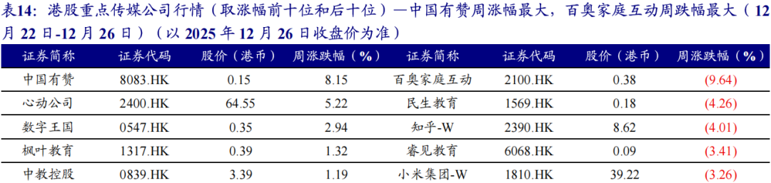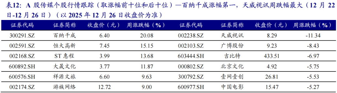 A股传媒板块2025年第52周(12月22日-12月26日)下跌0.18%,对比上证综指( 1.88%)、沪深300( 1.95%)、深证成指( 3.53%)、创业板指( 3.90%),表现居于下游。在我们追踪的传媒七大子板块中,互联网板块表现最好( 1.86%),体育板块表现较弱(-1.19%)。相对传媒指数/沪深300而言,互联网板块获得最高超额收益,分别为2.04%/-0.09%。