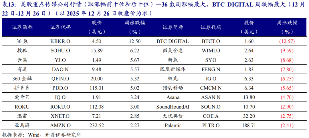 A股传媒互联网相关个股中,百纳千成周涨幅最大( 20.08%),天威视讯周跌幅最大(-11.34%);美股传媒互联网相关个股中,36氪周涨幅最大( 12.50%),BTC DIGITAL周跌幅最大(-12.57%);港股传媒互联网相关个股中,中国有赞周涨幅最大( 8.15%),百奥家庭互动周跌幅最大(-9.64%)。