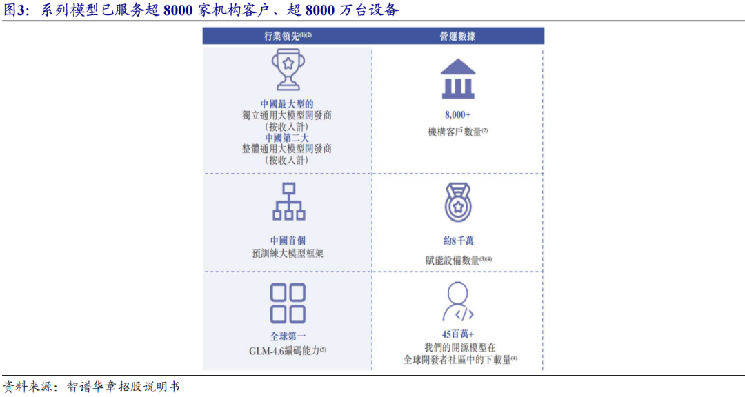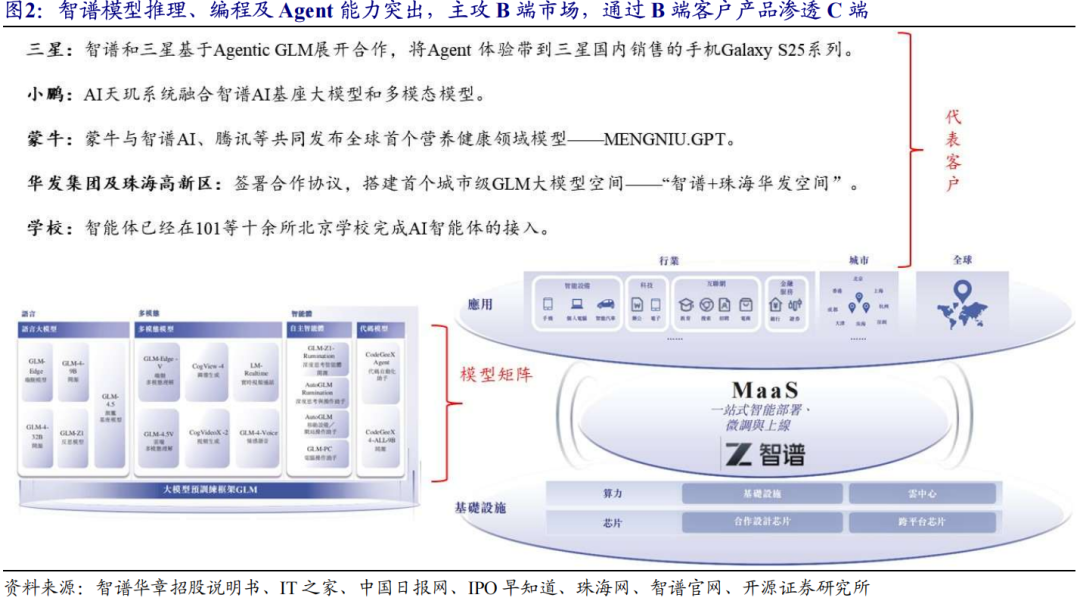 智谱:模型推理、编程及Agent能力突出,主攻B端市场,并通过B端客户产品渗透C端。公司基于GLM架构研发语言大模型、多模态模型、自主智能体及代码模型,2025年12月推出的GLM‑4.7刷新多项SOTA,在LM Arena的WebDev榜单(大模型真实前端/Web应用开发能力测评)里登顶开源模型序列,超过GPT-5.2和Claude-Sonnet-4.5。截至2025年12月,系列模型已为超12000家机构客户、超8000万台设备提供支持,代表客户包括三星、小鹏等。2025年11月,公司日均token消耗量为4.2万亿。公司重视与算力硬件厂商的合作,截至2025年6月,模型已与超40款主流硬件芯片兼容,这使公司能在多元硬件环境中高效训练。