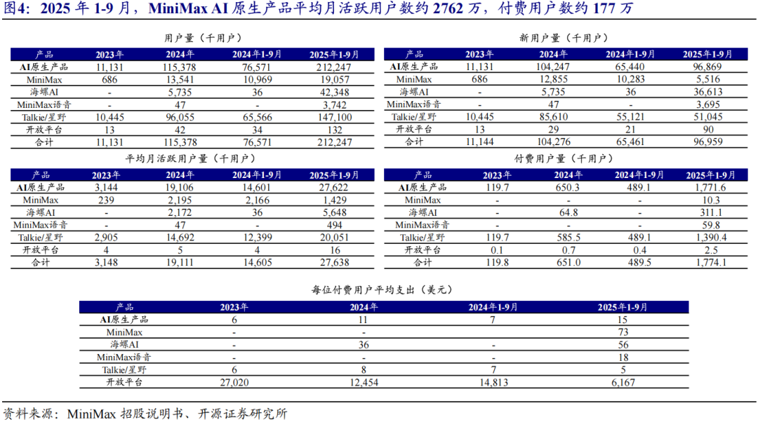MiniMax:多模态模型能力突出,产品线丰富,月活接近2800万。MiniMax自研大语言模型、视频生成模型及语音生成模型,其中语言生成模型Speech-02一经推出便被公认为全球顶尖水平。AI原生产品包括Agent应用MiniMax、视觉生成平台海螺AI、虚拟陪伴平台Talkie/星野等。2025年1-9月,MiniMax AI原生产品用户量2.12亿,平均月活跃用户数约2762万,付费用户数约177万,每位付费用户平均支出15美元。