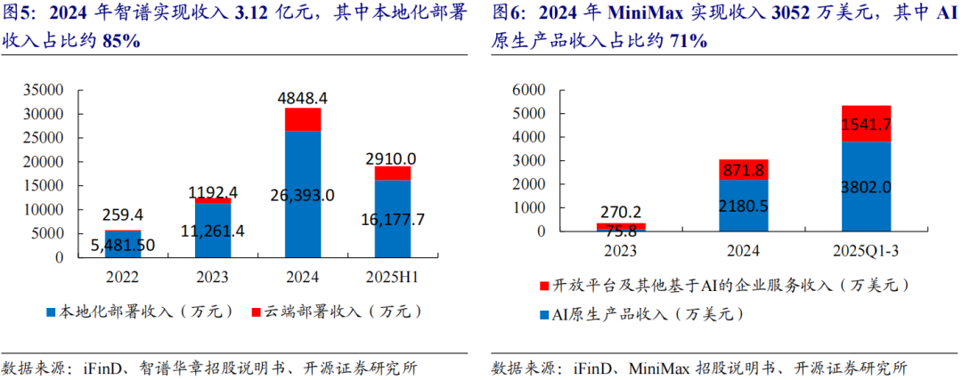 面向B端的本地化部署为智谱核心业务,Talkie/星野是MiniMax的支柱产品。2024年智谱实现收入3.12亿元,其中本地化部署(依托客户自有基础设施部署模型)收入占比约85%。2025H1智谱实现收入1.91亿元,同比 325%。2024年MiniMax实现收入3052万美元,其中AI原生产品收入占比约71%。2024年,Talkie/星野实现营收1946万美元,占总营收的64%,在线营销服务为主力变现模式。2025Q1-3,MiniMax实现营收5344万美元,同比 175%。