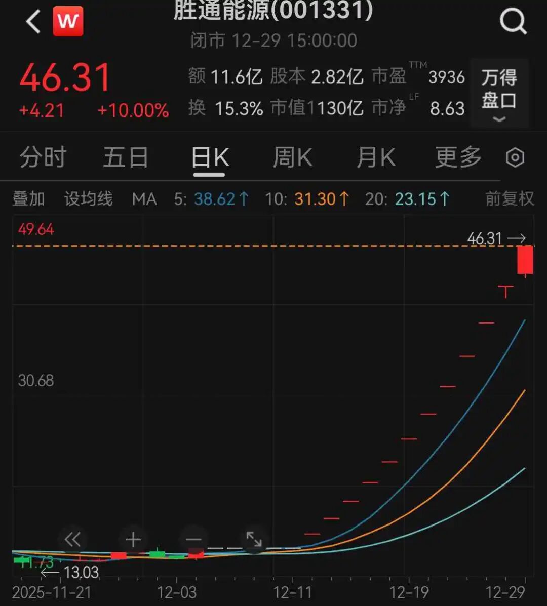 截至今日收盘,胜通能源涨停,报46.31元,总市值130亿元,这已经是该股连续12个交易日涨停。