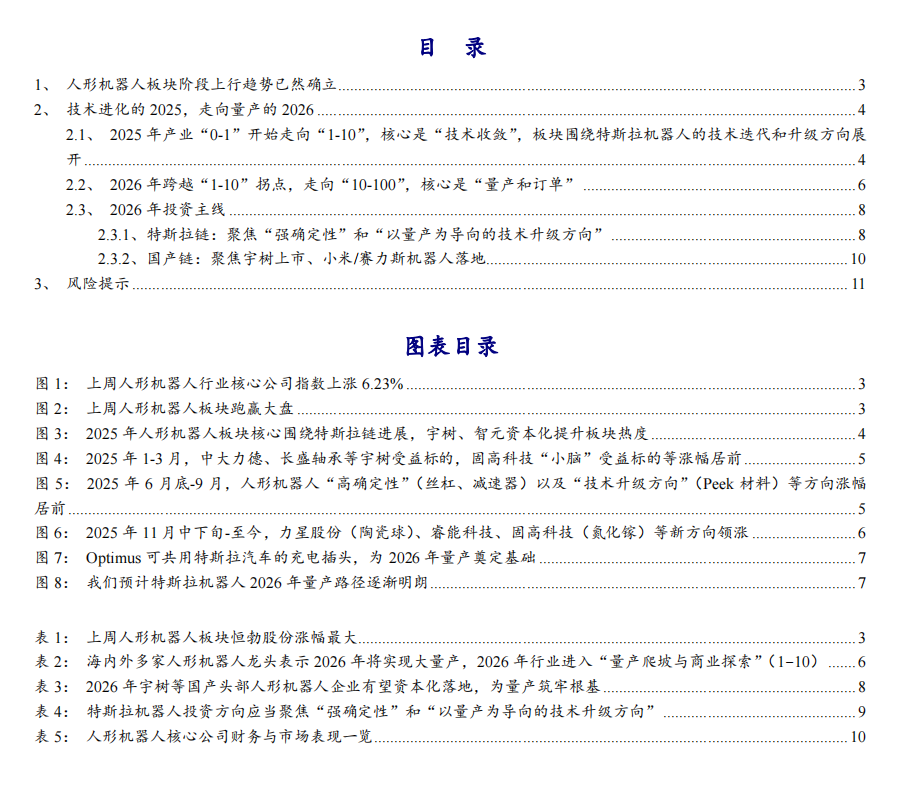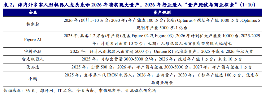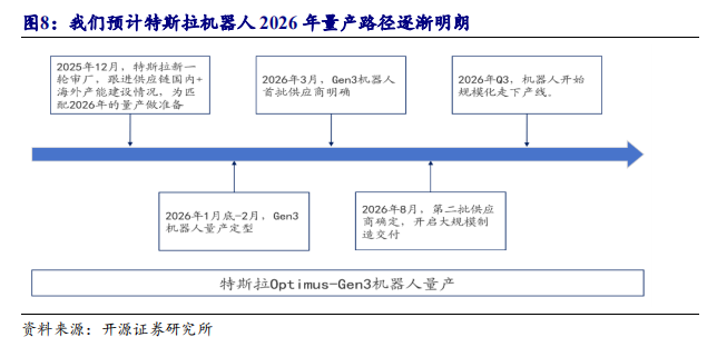 2、2026年跨越“1-10”拐点,走向“10-100”,核心是“量产和订单”。(1)特斯拉Gen2.5机器人或已完成硬件平台的锁版,设计基本冻结,关键总成预计需小步优化,为2026年量产版本Gen3筑牢基础;Gen3解决安全防护结构件和灵巧手后就将定型,我们判断2月份之内将会完成。(2)后期节奏展望:2026年3月份开启批量订单,8月份开启大规模制造,在此期间推动核心供应链标准化产能建设。(3)2026年上半年宇树等国产头部人形机器人企业有望实现IPO落地,为量产筑牢根基。(4)2026年人形机器人从政策端和产业端有望实现中美共振,板块迎来主升浪。