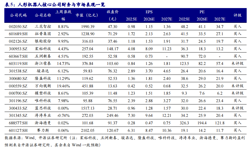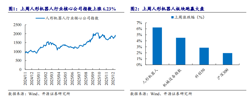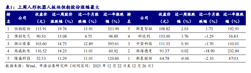 近期人形机器人板块指数企稳反弹,技术面与情绪面同步回暖,进入阶段性上行通道。上周(12月22日-12月26日,全文同)大盘整体上行,沪深300指数上涨1.95%,科创50指数上涨2.85%;核心公司指数上涨6.23%。周涨跌幅榜排名前五:恒勃股份(19.74%)、伟创电气(15.08%)、浙江荣泰(14.73%)、兆威机电(14.25%)、隆盛科技(11.29%);周涨跌幅后五位:新泉股份(-0.06%)、浙海德曼(0.02%)、中坚科技(0.50 %)、科达利(1.76 %)、斯菱智驱(2.03%)。