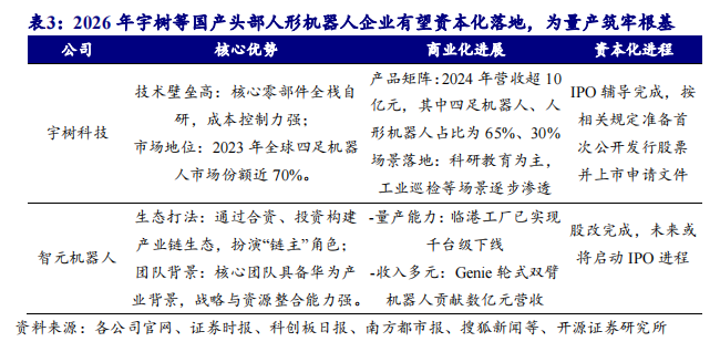 2026年上半年宇树等国产头部人形机器人企业有望实现IPO落地,为量产筑牢根基。宇树科技于2025年11月15日完成上市辅导;智元机器人股改完成,未来或将启动IPO进程;乐聚机器人在2025年10月30日完成IPO辅导备案;银河通用则于2025年11月完成股改。量产需要极强的资本实力,国产企业为实现量产需通过资本化获取资金以避免掉队。