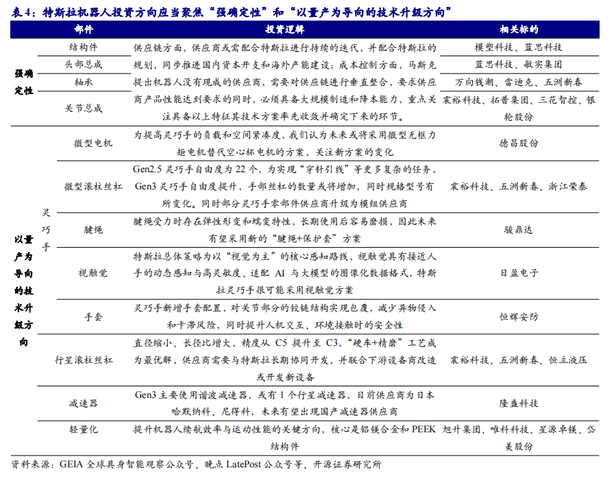 相关标的:(1)头部总成:受益标的:蓝思科技;(2)轴承:推荐五洲新春,受益标的:万向钱潮;(3)结构件:受益标的:模塑科技、蓝思科技、长盈精密;(4)关节总成:受益标的:拓普集团、三花智控;(5)灵巧手:推荐震裕科技、五洲新春、骏鼎达,受益标的:浙江荣泰、日盈电子、恒勃股份;(6)行星滚柱丝杠:推荐震裕科技、五洲新春,受益标的:恒立液压;(7)减速器:推荐隆盛科技;(8)轻量化:推荐唯科科技,受益标的:旭升集团、星源卓镁;(9)电机:受益标的:德昌股份、金力永磁、伟创电气、步科股份、雷赛智能;(10)电子皮肤及覆盖材料:受益标的:日盈电子、岱美股份、恒辉安防;(11)其他:推荐标的:浙海德曼、集智股份,受益标的:涛涛车业、双元科技。
