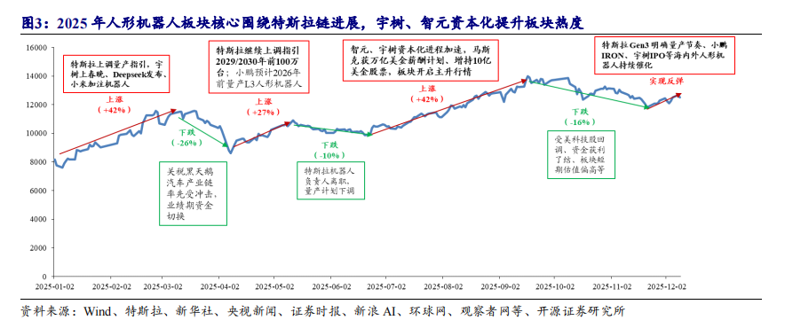 2025年人形机器人板块整体呈现出“事件驱动 主题扩散”的高弹性特征:一季度催化上行—二季度估值消化—三季度政策扶持与订单修复—四季度再度回调并实现反弹。核心驱动并非业绩,而是特斯拉链进展、国内外政策扶持与宇树、智元等头部机器人企业资本化进程。全年指数在高位经历了多次“事件驱动的情绪脉冲 估值回归”的往复。