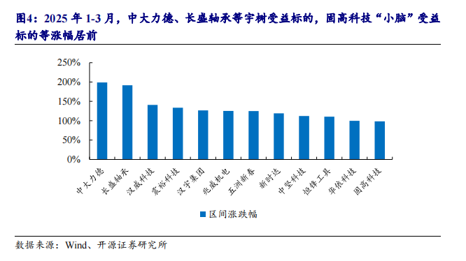 2025年1月-3月中,人形机器人板块上涨51%,“小脑”、宇树链等新方向涨幅居前,如中大力德、长盛轴承等宇树受益标的,固高科技(“小脑”受益标的)。期间,特斯拉上调机器人量产指引,为行业规模化发展注入强心剂;Deepseek 重磅发布相关技术成果,进一步夯实了机器人领域的技术底座;宇树机器人更是凭借春晚舞台的精彩亮相成功 “出圈”,极大地提升了市场对机器人赛道的关注度与认可度。在一系列利好的共振下,机器人板块整体上涨51%,其中固高科技(“小脑”领域受益标的)、长盛轴承(宇树链受益标的)等个股更是凭借清晰的赛道属性,收获了显著的涨幅。