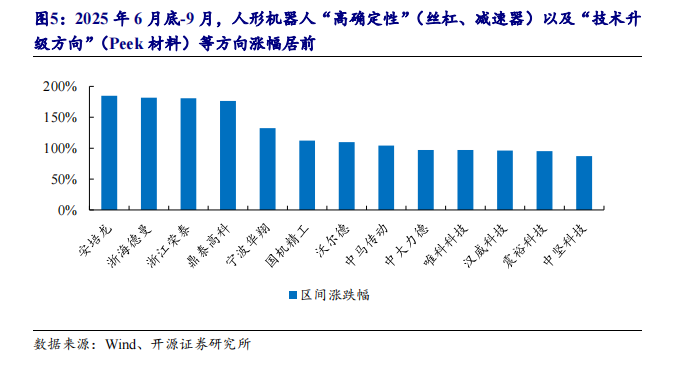 2025年6月底-9月,板块上涨约40%,人形机器人“高确定性”(丝杠、减速器)以及“技术升级方向”(Peek材料)等方向涨幅居前。随着智元、宇树等头部企业资本化进程持续加速,叠加马斯克斩获万亿美金薪酬计划、大手笔增持 10 亿美金股票的双重利好提振,机器人相关板块顺势开启强势主升行情,整体涨幅达到约 40%。在这一轮上涨行情中,机器人产业链的核心细分环节表现尤为亮眼,Peek 材料、丝杠、减速器、传感器等赛道凭借技术壁垒高、下游需求旺盛的优势涨幅居于前列,其中浙海德曼(丝杠设备)、唯科科技(Peek材料)、震裕科技(丝杠)等,更是依托清晰的业务布局,成为板块上涨浪潮中的领军者。