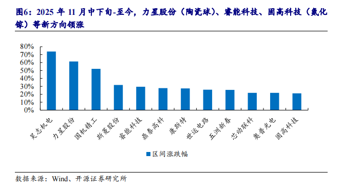 2025年11月中下旬-至今,板块实现反弹,陶瓷球、氮化镓等新方向领涨,为特定阶段下的主题投资。特斯拉明确Gen3人形机器人2026年一季度发布,百万台级产能规划进一步强化了产业链增长预期;小鹏机器人2026年底量产计划落地在即;宇树科技IPO进入冲刺阶段,叠加其机器人登陆演唱会完成消费级场景技术验证,商业化落地进程持续加速。在这些利好共振下,板块迎来估值修复行情,而陶瓷球、氮化镓等新方向股价表现尤为突出,引领板块反弹行情。