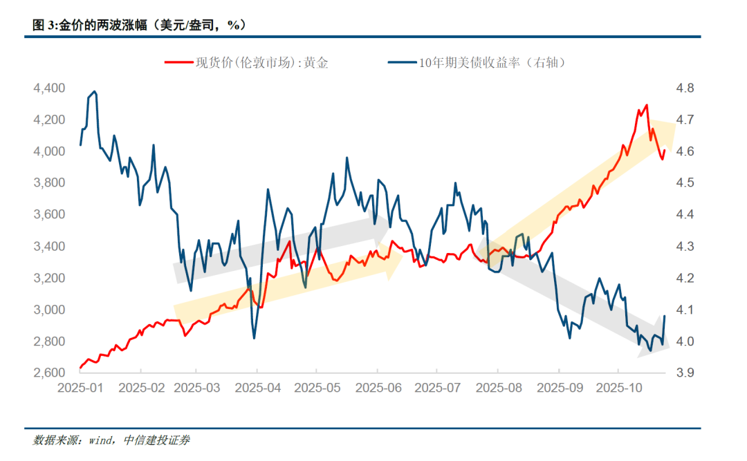 在经济不确定性和宽松预期的背景下,黄金受益于金融属性(与实际利率负相关)和避险属性的双重驱动,对利率信号反馈高度敏感。