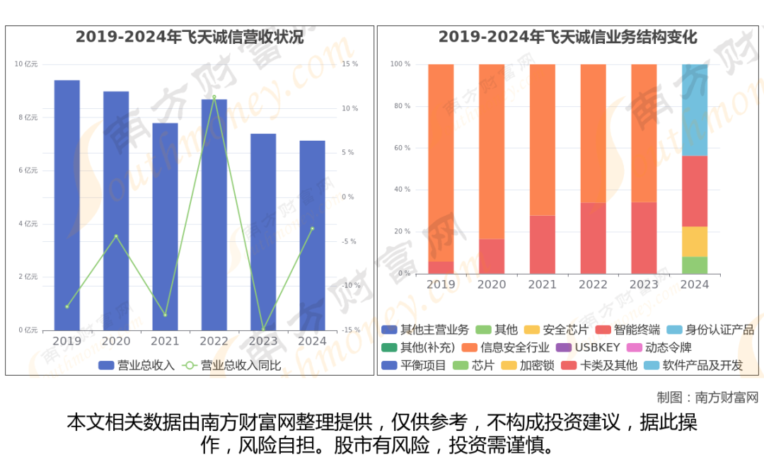 (如上图)2024年飞天诚信公司营业总收入7.13亿,同比增长-3.52%,近五年复合增长率为-5.63%。