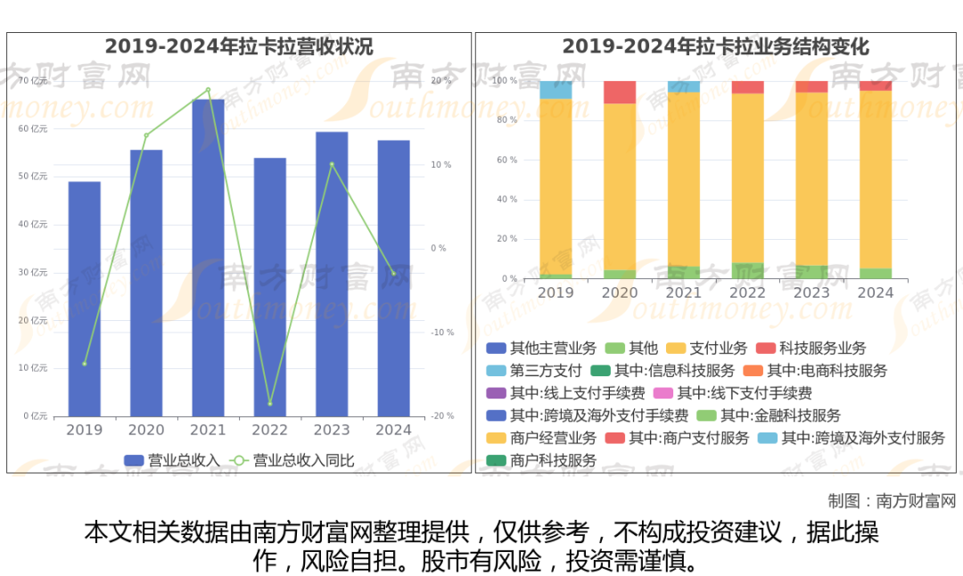 据年报数据显示(如上图),拉卡拉过去一年实现营业收入57.62亿,同比增长-2.98%,近5年复合年增长率0.88%。