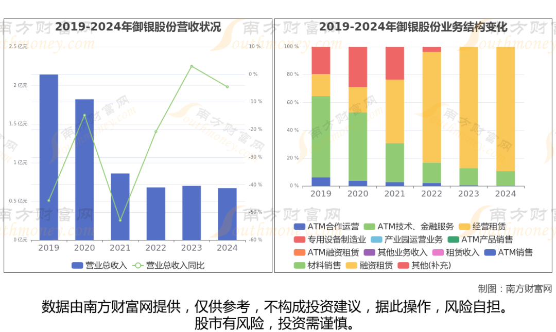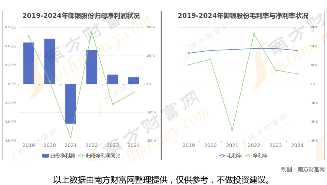 根据公司年度数据显示(如上图),2024年,御银股份实现营业总收入6687.47万,同比增长-4.55%,近5年复合年增长率-22.18%。