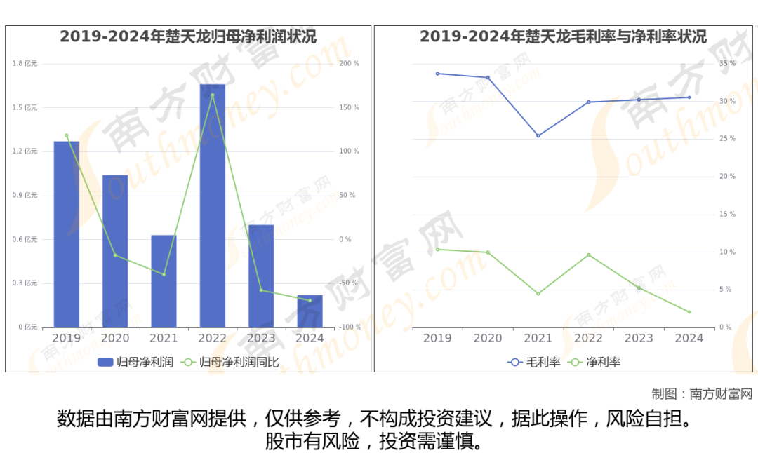 数据显示(如上图),楚天龙2024年营业收入为10.49亿,同比增长-21.52%,近5年复合年增长率0.57%。