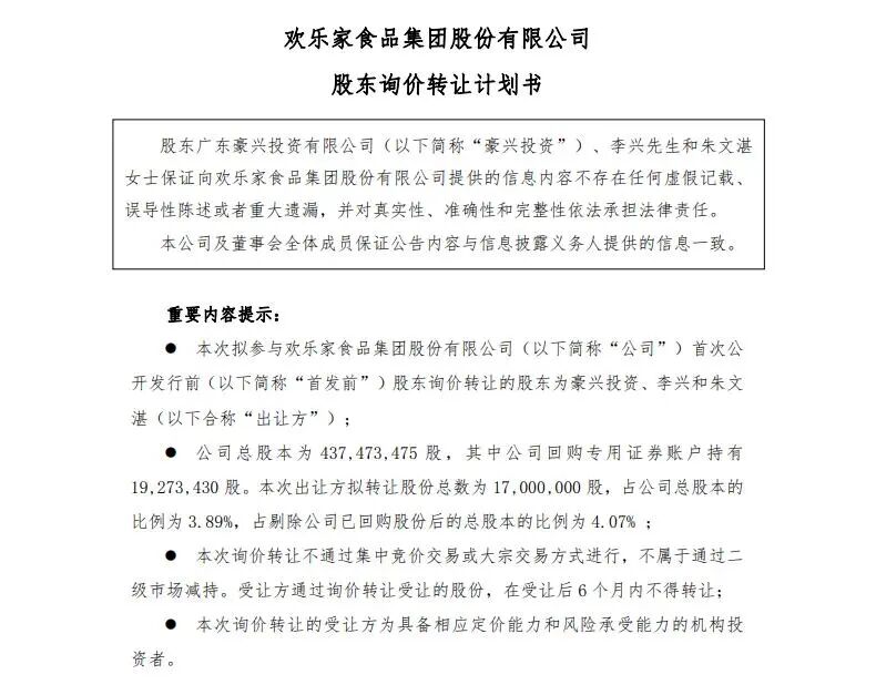 12月23日晚间,欢乐家发布公告显示,根据当日询价申购情况,公司股东豪兴投资、李兴和朱文湛本次询价转让初步确定的转让价格为19.43元/股。