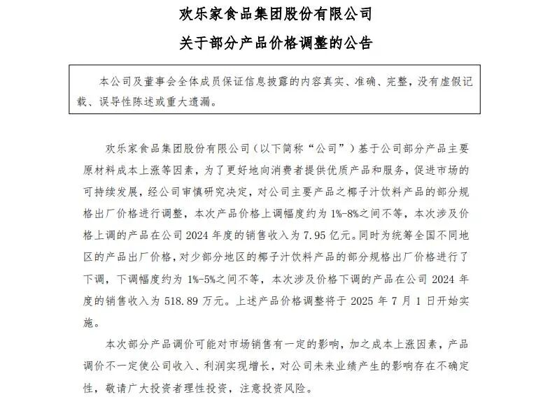 2025年6月,欢乐家公告称,基于公司部分产品主要原材料成本上涨等因素,为了更好地向消费者提供优质产品和服务,促进市场的可持续发展,经公司审慎研究决定,对公司主要产品之椰子汁饮料产品的部分规格出厂价格进行调整,本次产品价格上调幅度约为1%-8%之间不等,本次涉及价格上调的产品在公司2024年度的销售收入为7.95亿元。