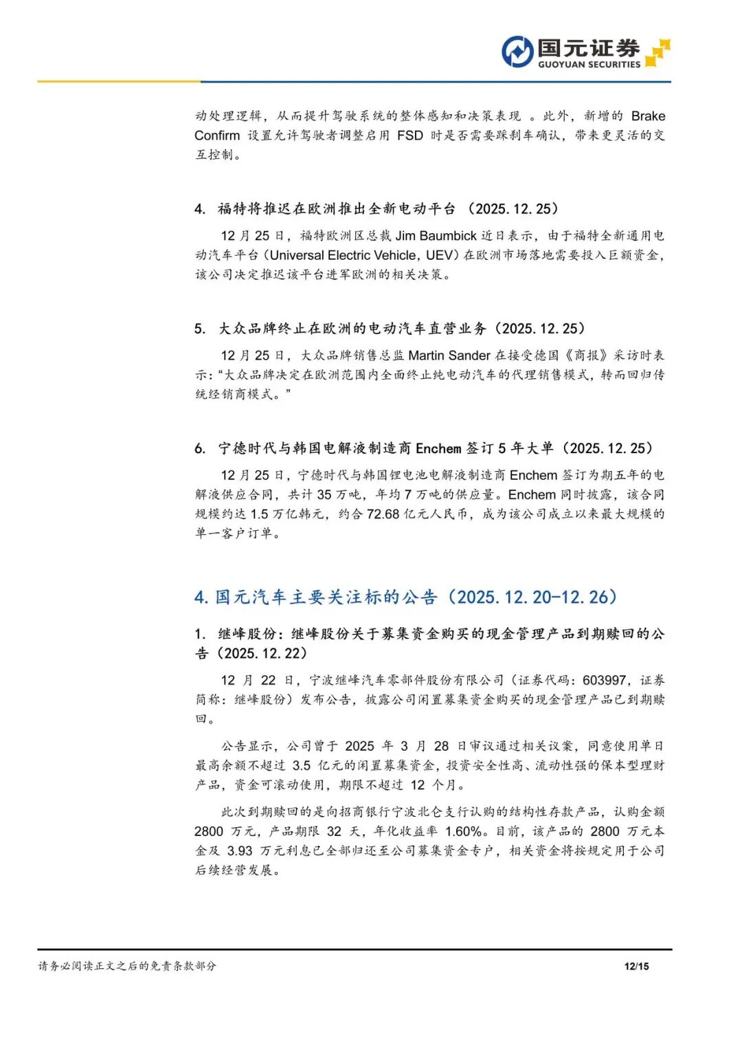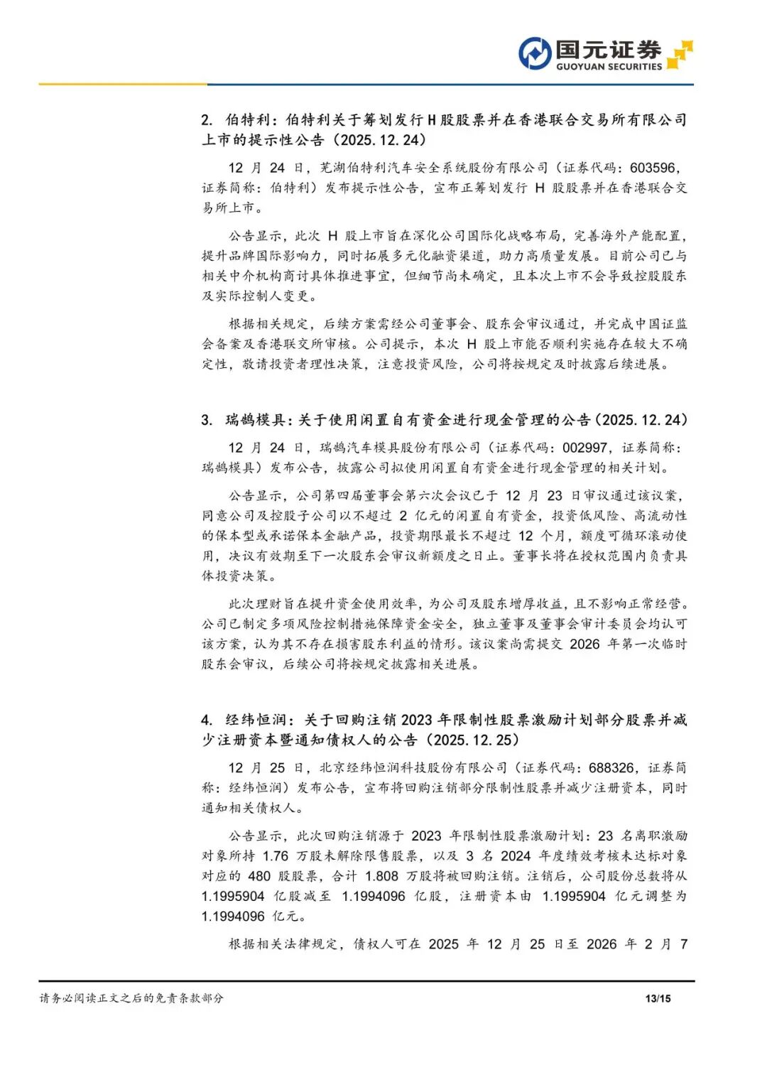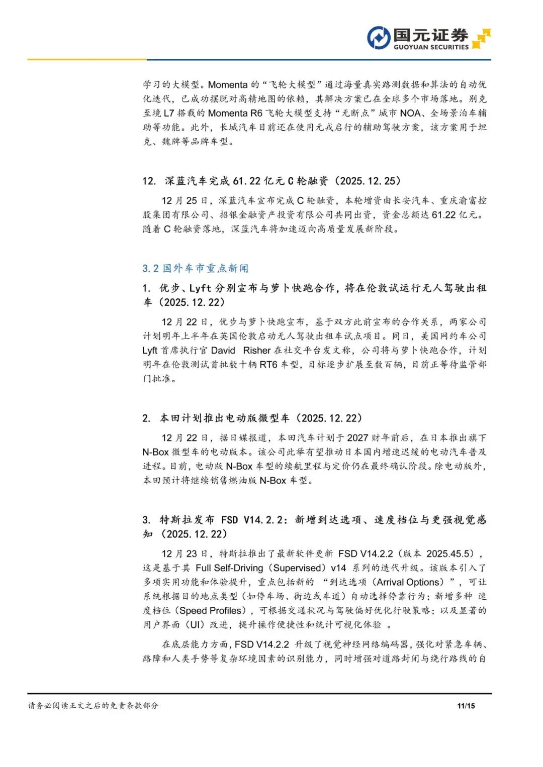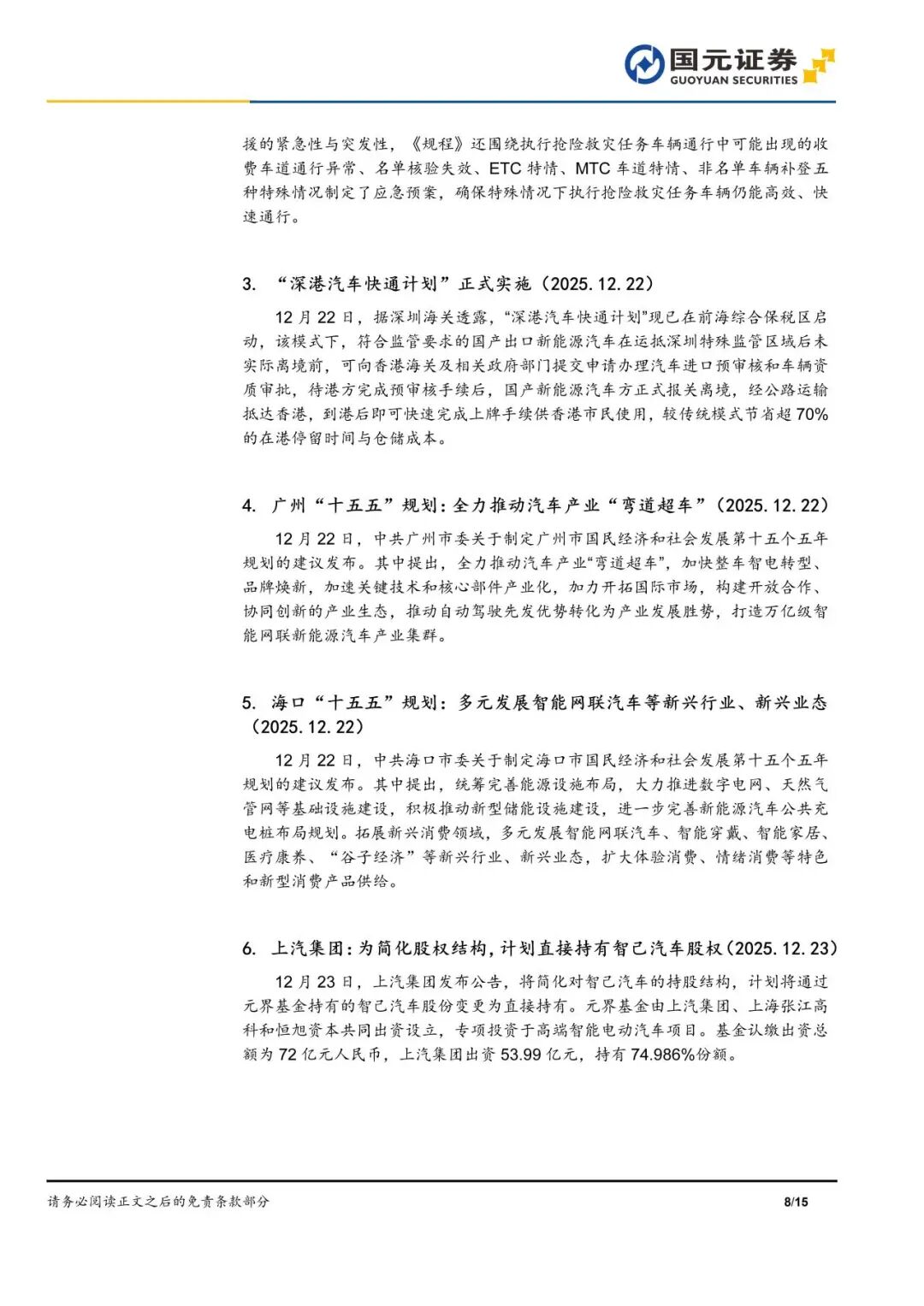 12月22日,中共广州市委关于制定广州市国民经济和社会发展第十五个五年规划的建议发布。其中提出,全力推动汽车产业“弯道超车”,加快整车智电转型、品牌焕新,加速关键技术和核心部件产业化,加力开拓国际市场,构建开放合作、协同创新的产业生态,推动自动驾驶先发优势转化为产业发展胜势,打造万亿级智能网联新能源汽车产业集群。同日,中共海口市委关于制定海口市国民经济和社会发展第十五个五年规划的建议发布。其中提出,统筹完善能源设施布局,积极推动新型储能设施建设,进一步完善新能源汽车公共充电桩布局规划,多元发展智能网联汽车、智能穿戴、智能家居等新兴行业。区域长期规划,汽车产业仍是重要内容。预计后续北京、上海、深圳、安徽等汽车发展关键区域,“十五五”规划也将高度重视汽车产业,尤其是智能网联汽车发展。