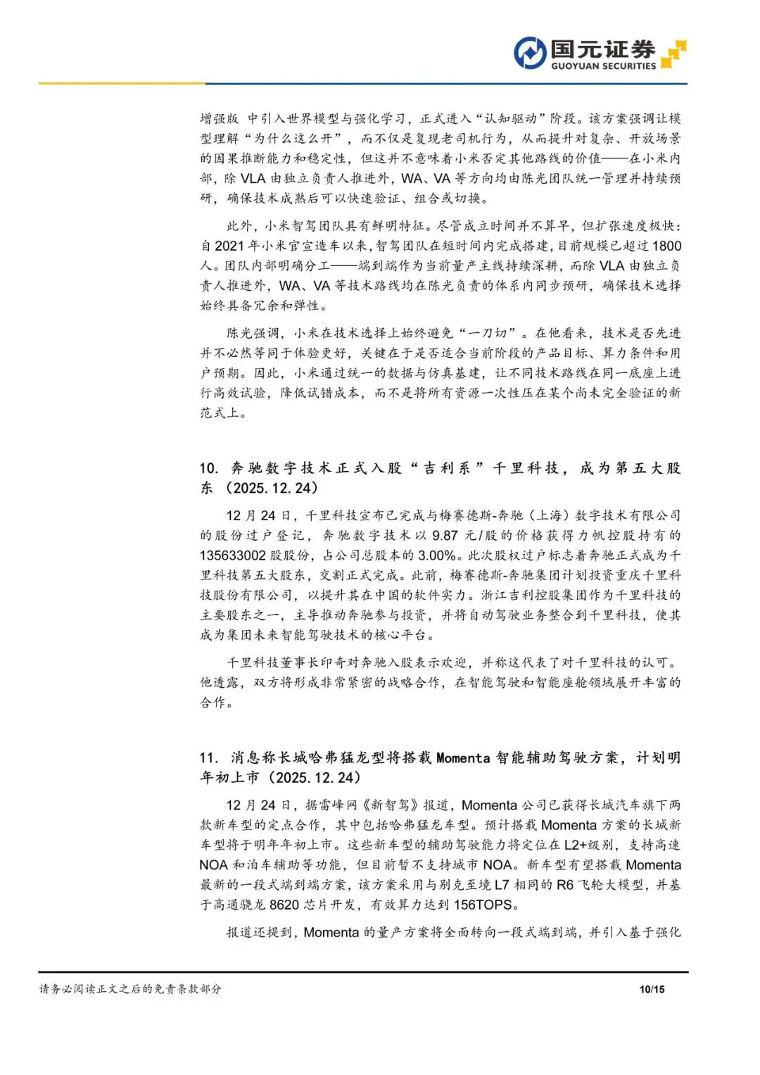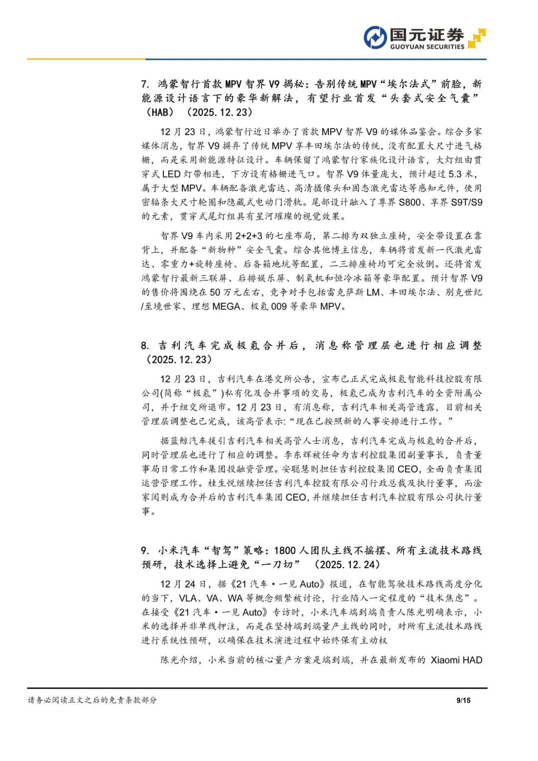 12月24日,小米汽车端到端负责人回应“智驾”策略,指出公司1800人团队主线不摇摆、所有主流技术路线预研,技术选择上避免“一刀切”。23日,鸿蒙智行近日举办了首款MPV智界V9的媒体品鉴会。产品告别传统MPV“埃尔法式”前脸,定义新能源设计语言下的豪华新解法,同时行业首发“头套式安全气囊”(HAB)。具备对造型、技术的首发定义权,是豪华车以及区域品牌渐入佳境的重要标志。国产智能豪华车品牌力呈现逐步上升趋势。
