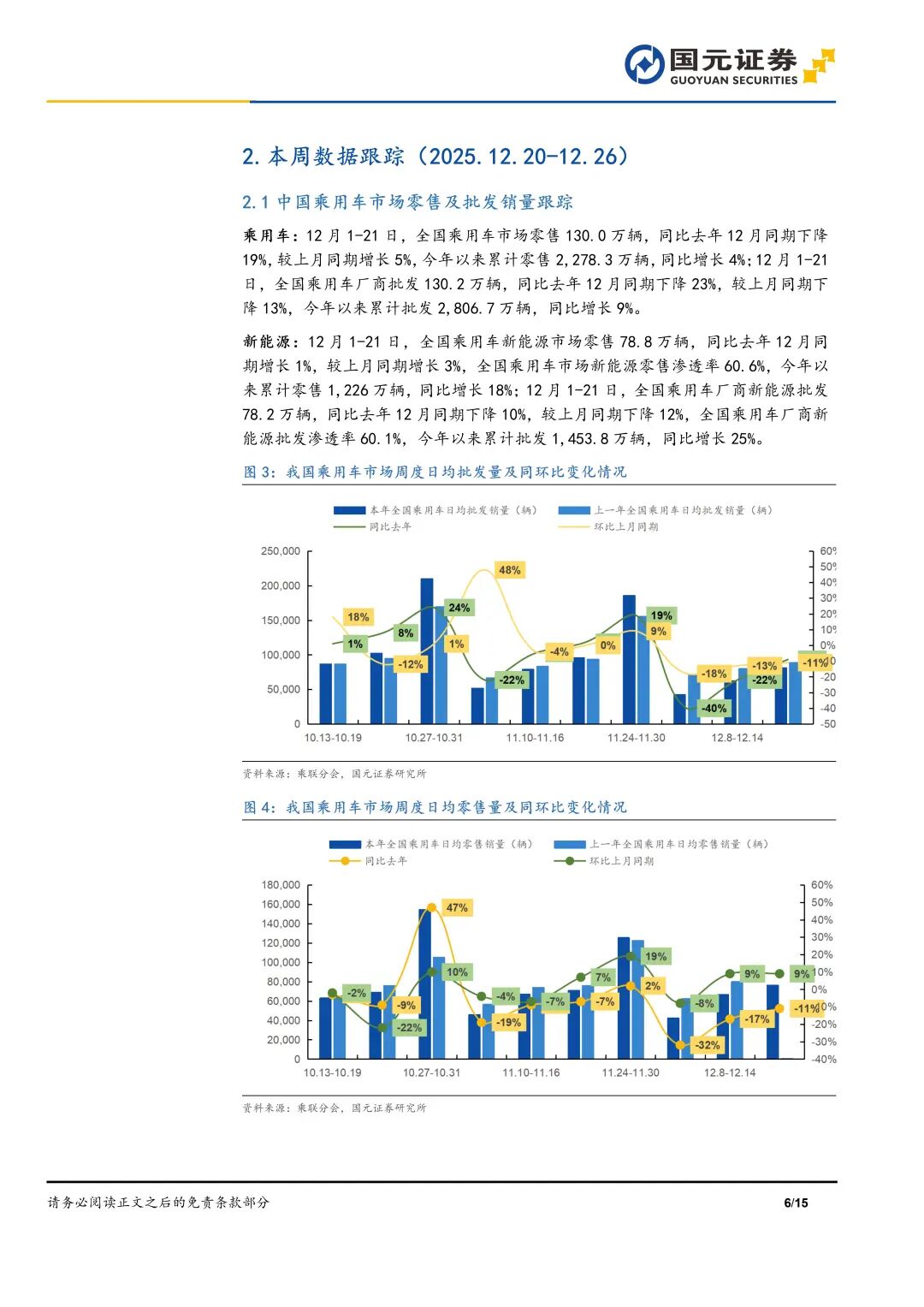 乘用车:12月1-21日,全国乘用车市场零售130.0万辆,同比去年12月同期下降19%,较上月同期增长5%,今年以来累计零售2,278.3万辆,同比增长4%;12月1-21日,全国乘用车厂商批发130.2万辆,同比去年12月同期下降23%,较上月同期下降13%,今年以来累计批发2,806.7万辆,同比增长9%。