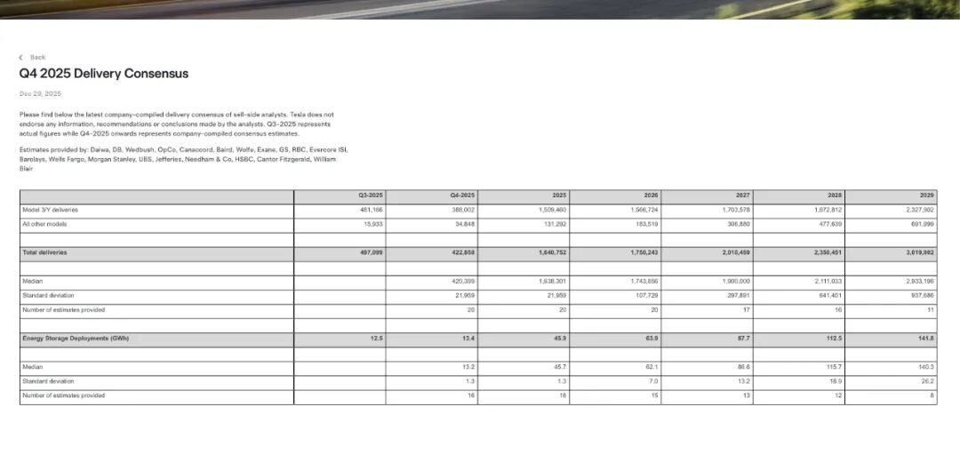 这份报告的发布正值2025年年末,旨在提升市场透明度。特斯拉强调,公司不认可任何分析师的具体观点或结论,该共识仅供参考。
