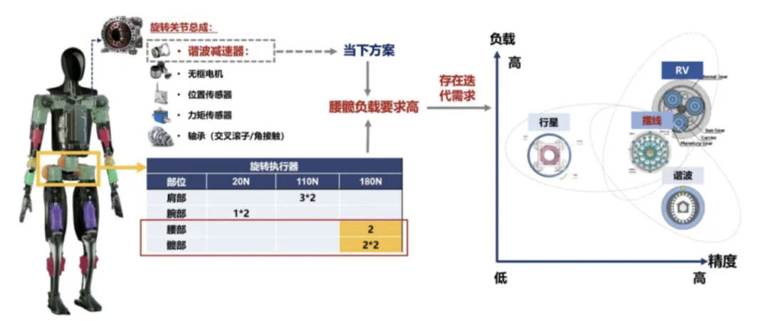 摆线减速器在高减速比和高精度情况下,负载也可保持较高水平,主要应用于人形机器人腰髋等重负载部位。