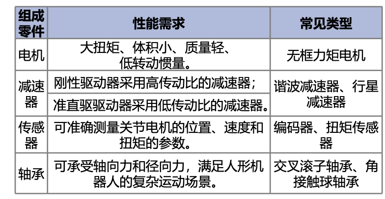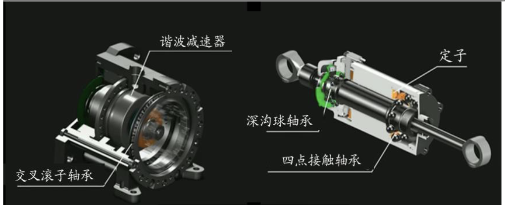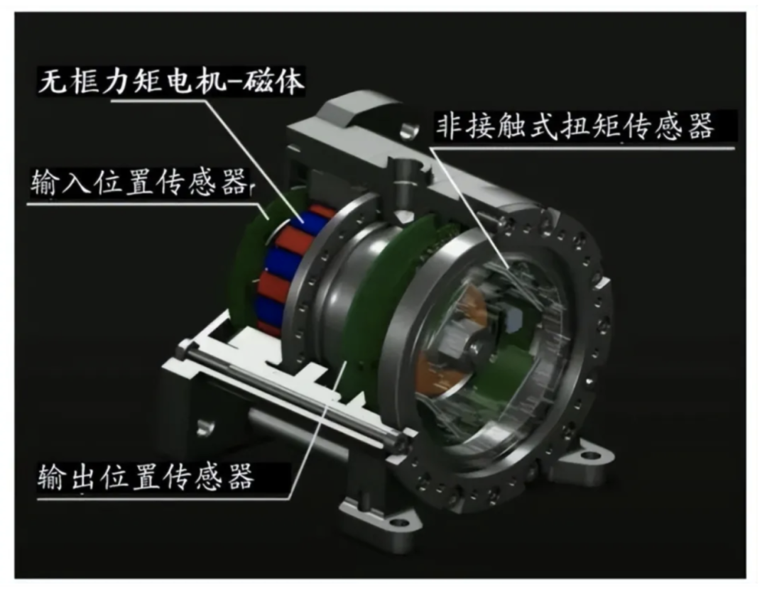 无框力矩电机提供动力,减速器用于降低转速、增大扭矩,力矩传感器和编码器用于监测运动状态,驱动器负责控制电机的运行。