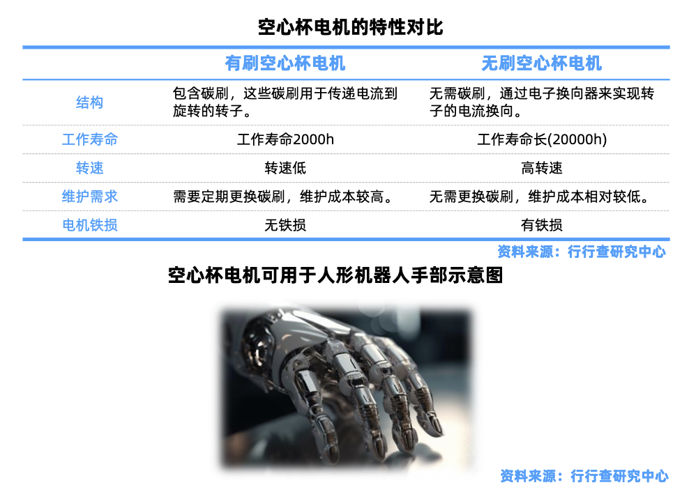 空心杯电机主要应用于灵巧手等小负载、高精度场景,大负载关节应用较少。