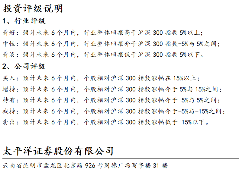 本报告信息均来源于公开资料,我公司对这些信息的准确性和完整性不作任何保证。负责准备本报告以及撰写本报告的所 有研究分析师或工作人员在此保证,本研究报告中关于任何发行商或证券所发表的观点均如实反映研究人员的个人观点。报告 中的内容和意见仅供参考,并不构成对所述证券买卖的出价或询价。我公司及其雇员对使用本报告及其内容所引发的任何直接 或间接损失概不负责。我公司或关联机构可能会持有报告中所提到的公司所发行的证券头寸并进行交易,还可能为这些公司提 供或争取提供投资银行业务服务。本报告版权归太平洋证券股份有限公司所有,未经书面许可任何机 构和个人不得以任何形式翻版、复制、刊登。任何人使用本报告,视为同意以上声明。