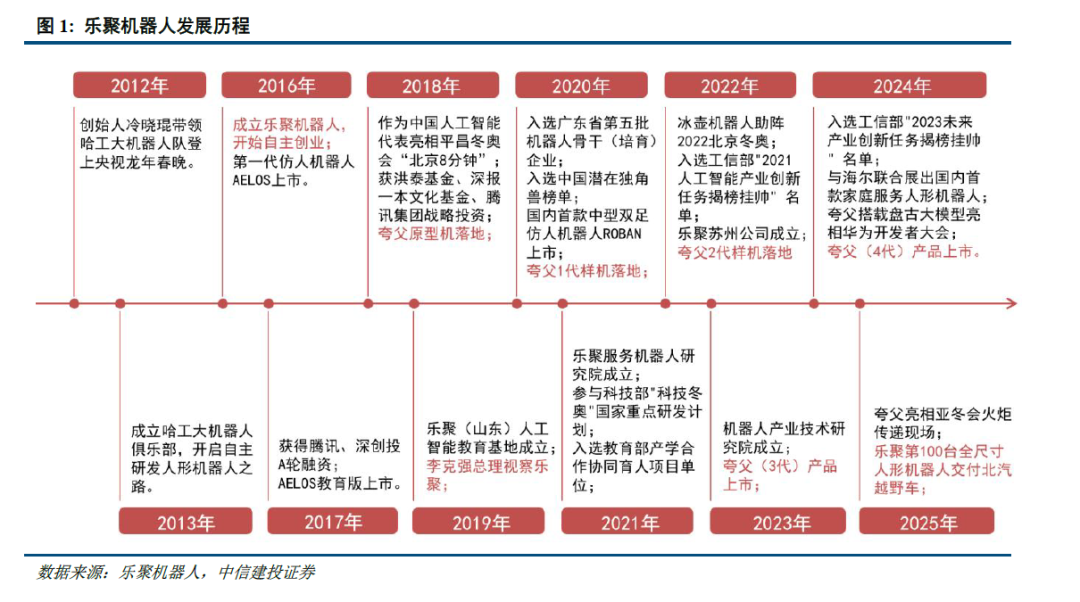 专注基于模型预测和强化学习深度融合的运动控制技术,实现工业场景率先落地。乐聚机器人成立于2016年,是国内最早布局人形机器人的企业之一,坚持以产业化应用为导向的融合模型预测与强化学习的具身智能移动操作框架。公司核心团队源自哈尔滨工业大学,技术积累深厚,专利数量行业领先。2023年底,公司实现全尺寸人形机器人“发布即量产”,并于2025年1月完成百台交付,成为国内首家。目前,公司已在汽车、3C等工业场景实现小批量落地,并与华为、中国移动等头部企业深度合作,共建5G-A具身智能生态。融资方面,公司已完成近15亿元Pre-IPO轮融资,并与东方精工、和而泰等成立合资公司,加速量产能力建设,预计2026年实现万台级产能。