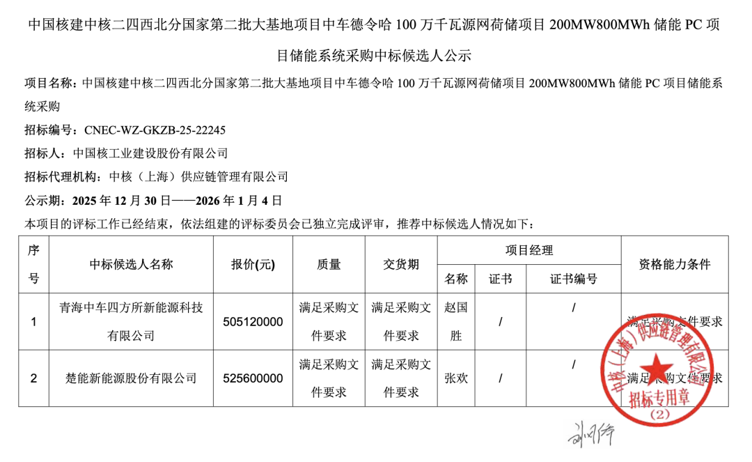 12月30日,中国核建中核二四西北分国家第二批大基地项目中车德令哈100万千瓦源网荷储项目200MW800MWh储能PC项目储能系统采购中标候选人公示。