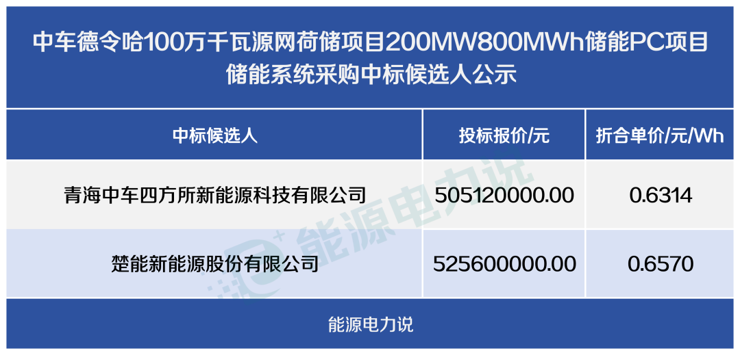 其中,第一中标候选人,青海中车四方所新能源科技有限公司,中国中车股份有限公司全资子公司中车青岛四方车辆研究所有限公司的全资子公司,投标报价50512万元,折合单价约0.6314元/Wh。