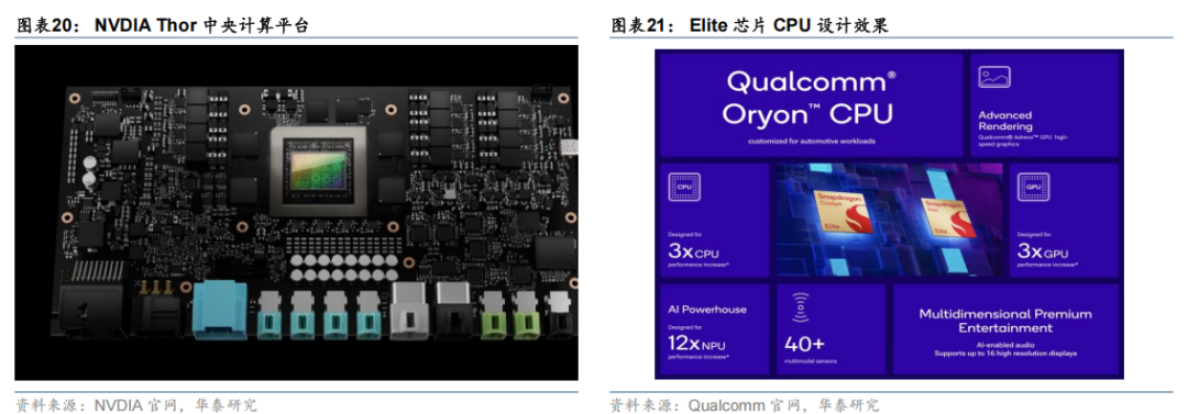 汽车芯片领域正经历从性能竞争向生态整合的转变。1)在高端市场,NVIDIA Thor芯片以2000 TOPS(FP8精度)的算力优势吸引极氪等车企采用,目标2025年量产,主打L4级自动驾驶的算力需求;2)与此同时,高通则选择了差异化路径,其Snapdragon Ride Elite平台虽然AI性能提升幅度(较上代12倍)不及NVIDIA的绝对算力水平,但凭借“舱驾一体”架构和在座舱娱乐、5G连接方面的既有优势,成功获得奔驰和理想的订单;3)在量产市场,Mobileye的EyeQ6 Lite以性价比策略占据主导地位,4600万辆的订单量显示其在L2 级ADAS市场的渗透率优势,2024年已开始量产。