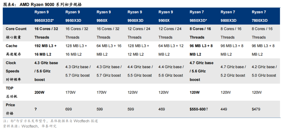 桌面端方面,9850X3D是9800X3D的升级版本,最高加速频率达5.60GHz,较9800X3D提升400 MHz,热设计功耗维持120W,据Techpowerup预计,其单线程性能将提升5-7%。9950X3D2最高加速频率为5.60 GHz,较9950X3D的5.70 GHz降低了100 MHz,但该处理器的两个芯片均搭载3D V-Cache,可实现更灵活的调度与线程迁移,相较仅单芯片组配备3D V-Cache的9950X3D实现显著升级。考虑到配备192 MB的L3 cache,9950X3D2可能更受对内存密集型任务有需求的工作站用户和创作者群体青睐。移动端方面,Ryzen AI 400系列(代号Gorgon Point)是基于Zen 5架构的Strix Point升级版,Techpowerup预计将包含七款型号。据Techpowerup报道,市场普遍预期该系列已准备就绪,即将进入OEM厂商验证阶段。