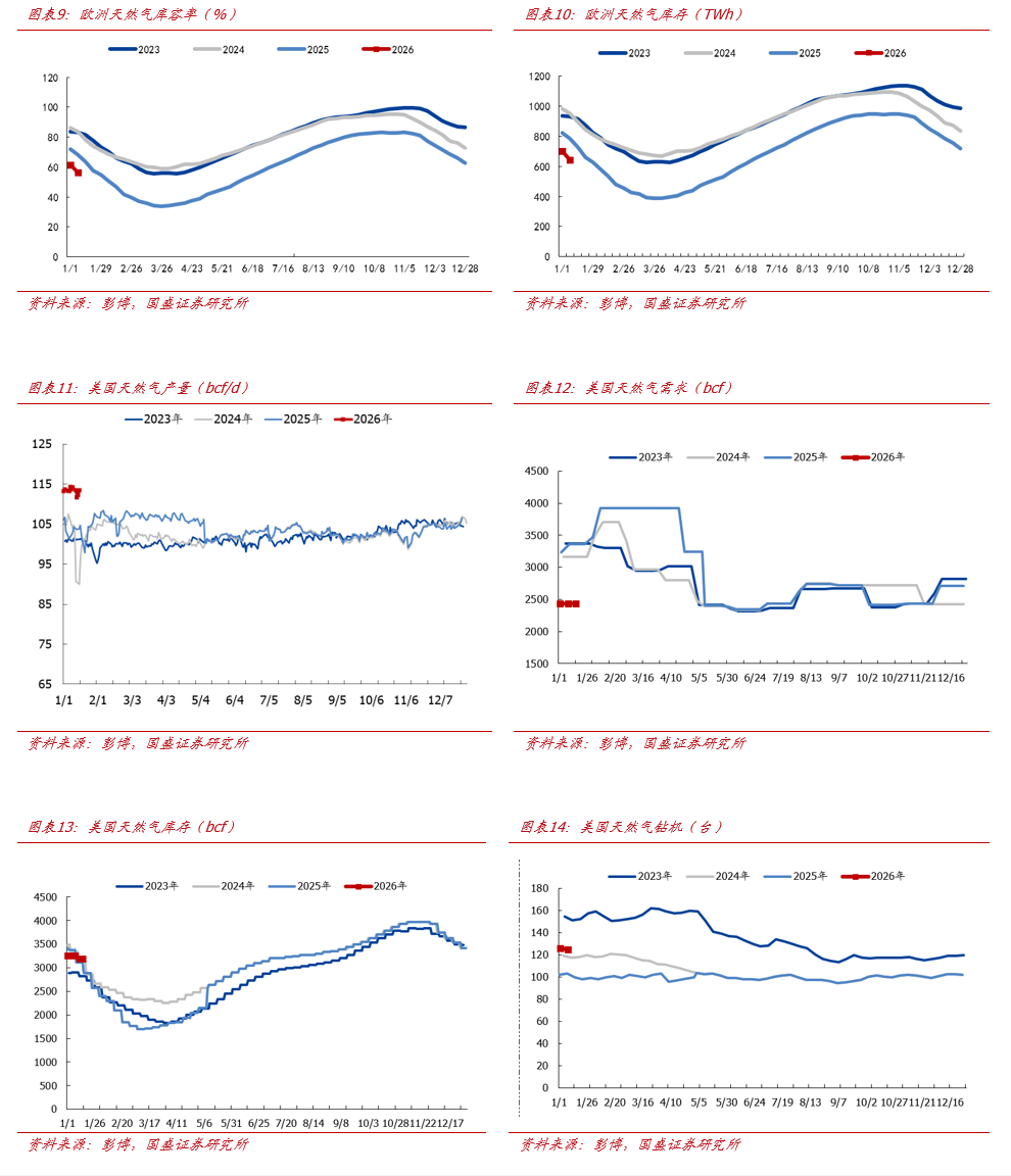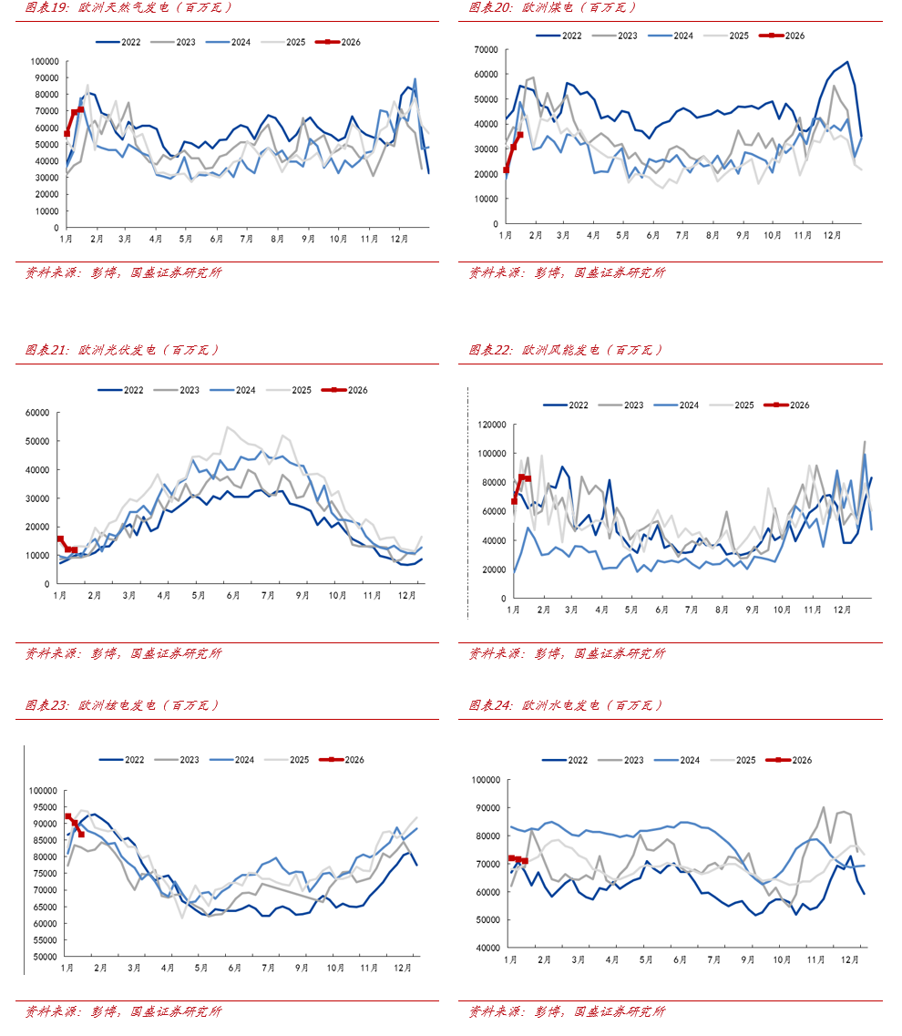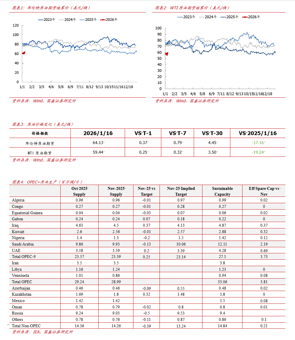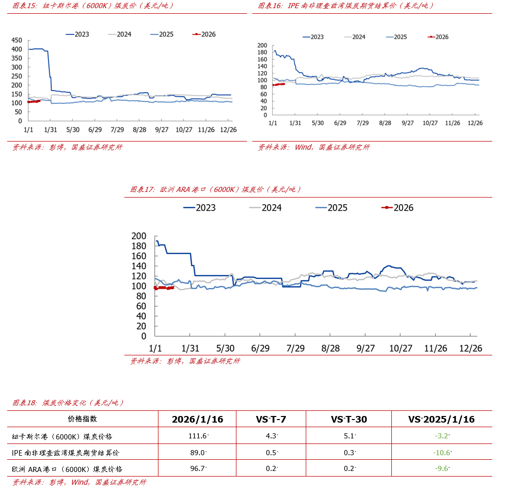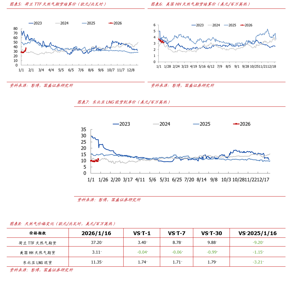 周全球能源价格回顾。截至2026年1月16日,原油价格方面,布伦特原油期货结算价为64.13美元/桶,较上周上涨0.79美元/桶( 1.25%);WTI原油期货结算价为59.44美元/桶,较上周上涨0.32美元/桶( 0.54%)。天然气价格方面,东北亚LNG现货到岸价为11.35美元/百万英热,较上周上涨1.71美元/百万英热( 17.72%);荷兰TTF天然气期货结算价37.2欧元/兆瓦时,较上周上涨8.78欧元/兆瓦时( 30.87%);美国HH天然气期货结算价为3.11美元/百万英热,较上周下降0.06美元/百万英热(-1.89%)。煤炭价格方面,欧洲ARA港口煤炭(6000K)到岸价96.7美元/吨,较上周上涨0.2美元/吨( 0.2%);纽卡斯尔港口煤炭(6000K)FOB价111.6美元/吨,较上周上涨4.3美元/吨( 4.0%);IPE南非理查兹湾煤炭期货结算价89.0美元/吨,较上周上涨0.5美元/吨( 0.6%)。