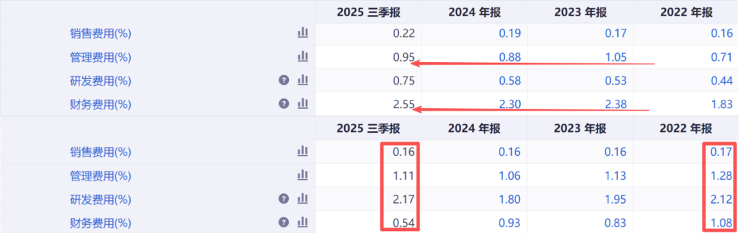 反观新凤鸣,同期营收515.42亿元,同比增长4.77%;扣非归母净利润7.76亿元,同比增长21.76%。关键在于,这7.76亿元几乎全部来自主业经营,长期股权投资占比不足1%,利润结构干净透明。更重要的是,公司通过精细化排产与供应链协同,有效控制运营成本;四项费用率从2022年的4.65%稳步降至3.98%,在研发投入不减的情况下实现费用优化,展现出更强的成本韧性。