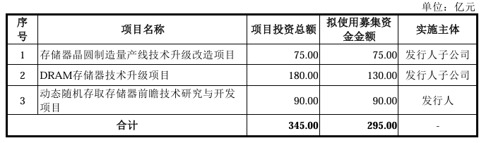 此次IPO,长鑫科技拟募资295亿元,用于存储器晶圆制造量产线技术升级改造项目、DRAM存储器技术升级项目、动态随机存取存储器前瞻技术研究与开发项目建设,合计总投资规模达345亿元。