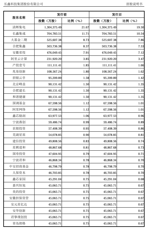 长鑫科技股东团队方面,合肥清辉集电企业管理合伙企业持股比例21.67%,为长鑫科技第一大股东。国家集成电路产业投资基金二期(大基金二期)、安徽省投资集团、招银国际、人保资本、建信金融、国调基金、君联资本、小米产投等众多知名机构均位列股东名单之中。
