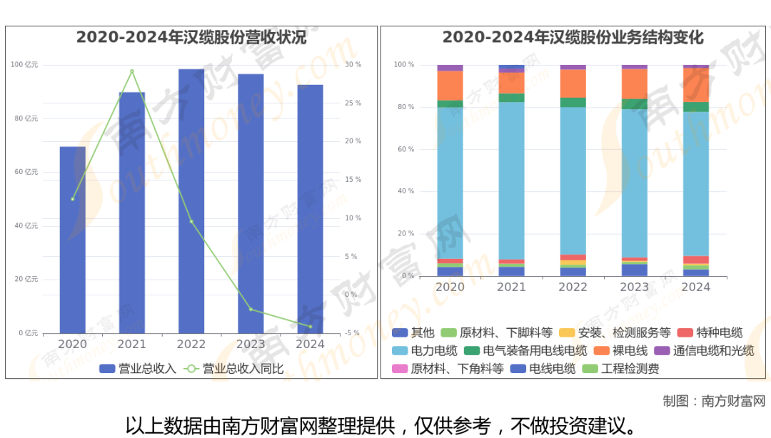 (如上图)2024年汉缆股份公司营业总收入为92.6亿,同比增长-4.12%,近5年复合增长率为7.43%。