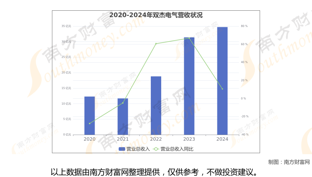 根据公司年度数据显示(如上图),2024年,双杰电气实现营业总收入34.73亿,同比增长10.6%,近5年复合年增长率29.59%。