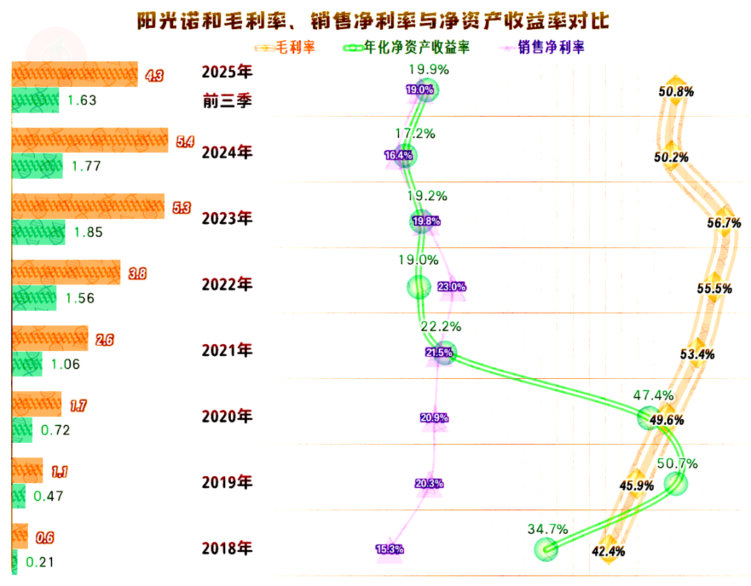 销售净利率与毛利率的距离有逐步拉大的趋势,转折年份是2023年,当年的毛利率创下新高,销售净利率反而在下降,2024年继续下降,2025年前三季度有所反弹。