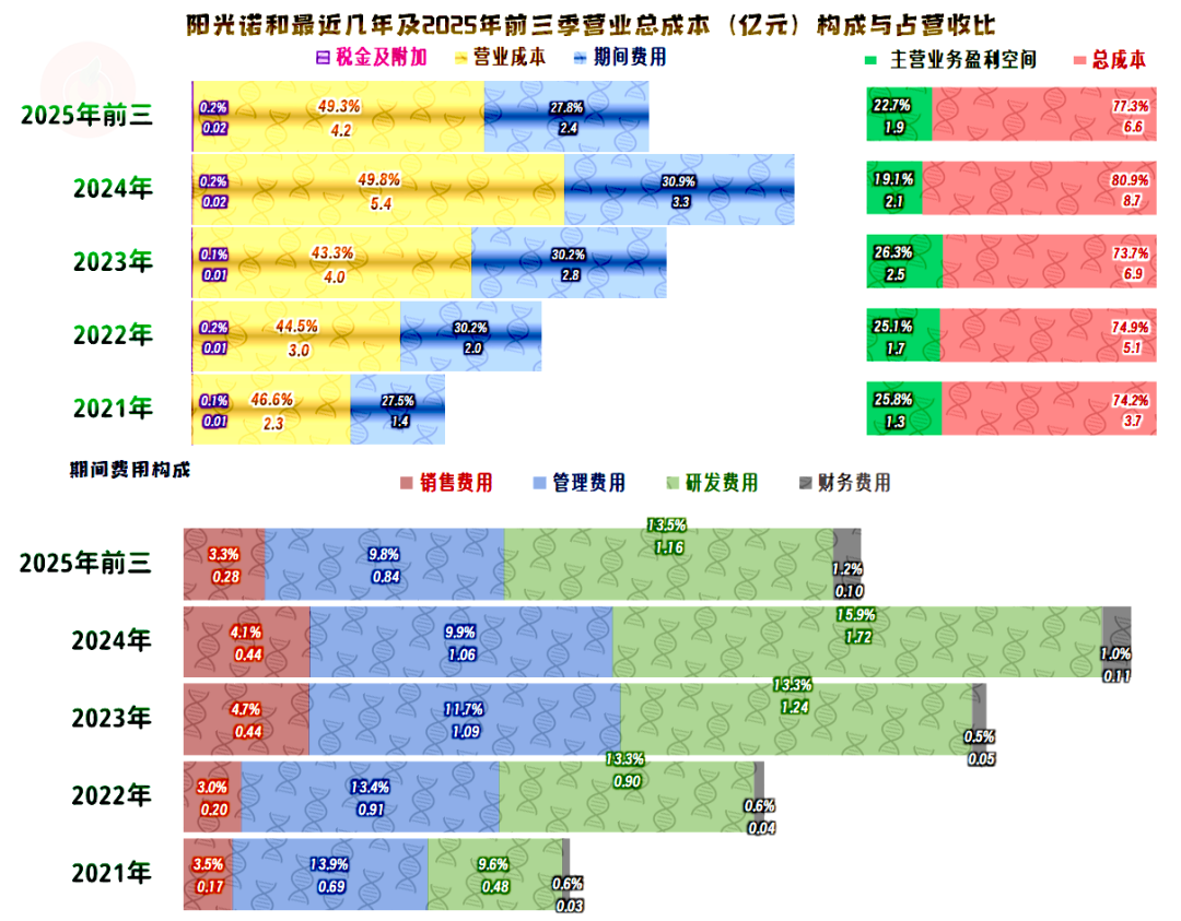 不管是按上限,还是下限算,阳光诺和2025年的净利润都会扭转上年亏损的形势,并刷新盈利新纪录,大概率会突破2亿元的水平。从2023年以来,净利润增长慢于同期营收增速,甚至在2024年出现了下跌,多年的规模效应发挥,也遇到了阻力,我们一会儿看成本费用构成的时候再找出其具体原因。