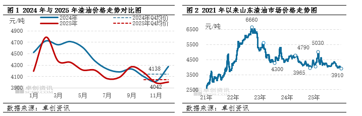 2025年四季度国内渣油价格呈现跌后震荡走势,四季度山东低硫渣油均价4042元/吨,环比下跌2.31%,同比下跌2.3%。山东中硫渣油均价3720元/吨,环比下跌6.79%,同比下跌4.59%。季度内呈现“跌-涨-跌”态势,10月国际原油价格持续下行,核心利空因素来自美国针对中国的贸易威胁,带动渣油价格同步走低,月内跌幅达到200元/吨,创下季度内最大单月跌幅。11月份俄乌和谈持续推进使得地缘风险溢价逐步消退,原油价格转入震荡下行通道,渣油价格受此影响呈现区间弱势震荡走势,波动幅度较10月明显收窄。12月份地缘扰动频繁,原油市场维持弱震荡格局,渣油价格跟随成本端窄幅调整,整体走势相对平稳。