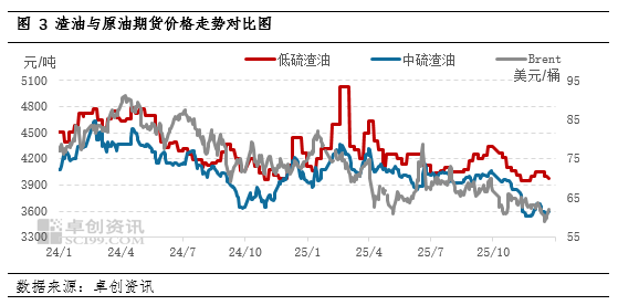 成本走低对渣油价格的支撑减弱。2025年四季度原油价格震荡下行,美原油从62美元/桶下跌至58美元/桶。进入四季度,美国斡旋东欧和谈、地缘冲突反复;美国石油需求转淡、累库趋势,对于油市的影响转为利空;经济走弱叠加美联储降息不及预期导致宏观压力持续、产能过剩预期等因素影响,四季度原油价格震荡偏下运行,对于渣油成本端支撑减弱。