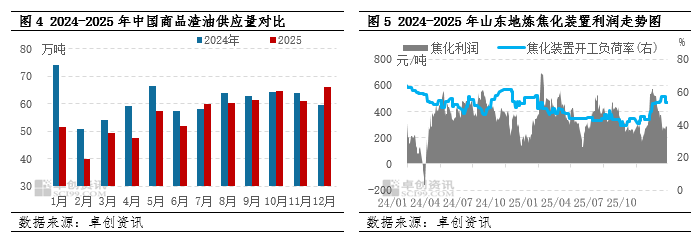 供需端:供应先增后稳,需求逐步复苏。供应端方面,一季度山东地炼常减压装置开工负荷预计先跌后涨,均值较2025年四季度提升。随着部分前期检修炼厂逐步恢复生产,渣油商品量有望增加,市场存在一定供应压力。需求端方面,随着春节后下游行业逐步复工复产,山东地炼焦化装置开工率有望稳步回升,对渣油的刚需支撑将有所增强。同时,沥青市场需求有望进入季节性复苏阶段,对渣油的分流需求或进一步增加。
