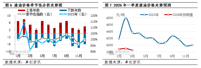 预计2026年一季度渣油价格呈现震荡上涨的走势。预计2026年一季度渣油价格分别为3880元/吨、3950元/吨、3900元/吨。1月份受需求趋淡以及春节前排库影响,下游炼厂备货心态谨慎,渣油价格仍然面临回调压力,不过地缘溢价使得渣油跌势放缓,均价或回落至3900元/吨以下。2-3月,随着节后复工复产推进,下游需求逐步释放,渣油价格有望迎来小幅反弹。但考虑到整体供应趋于宽松、原油价格承压不减,反弹幅度将受到制约,整体维持区间震荡走势,预计渣油价格在3850-3900元/吨运行。