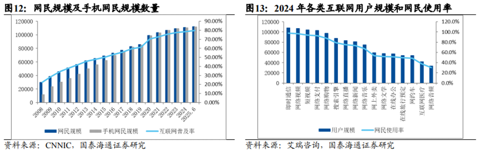 AI已成为互联网基建,用户空间预计11亿人。目前AI已经融入各类互联网应用,成为互联网基础建设,预计AI应用空间是网民规模11亿人(2025年6月)。各垂类AI应用用户空间预计对标互联网垂类用户数,比如AI搜索对标搜索引擎用户规模8.8亿人、AI电商对比网络购物用户数9.7亿人(2024年)。